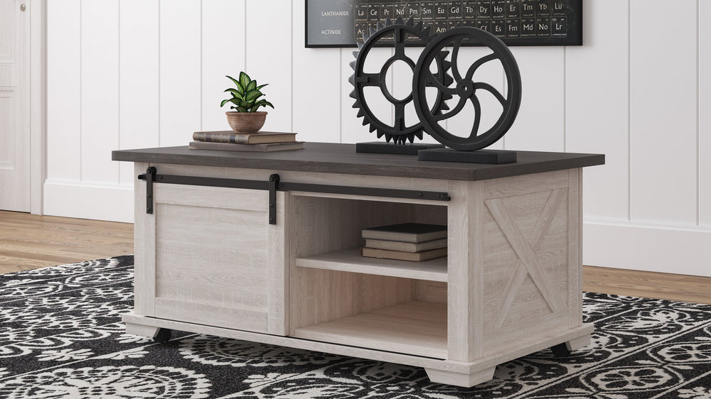 Raise the bar on modern farmhouse design with this versatile occasional table set. Sporting a two-tone, gray and antiqued white color scheme and cross buck design, this table's handy spring-loaded mechanism of the cocktail table brings the tabletop closer to you. This versatile table makes it easier than ever to eat, work or play from the comfort of your sofa.