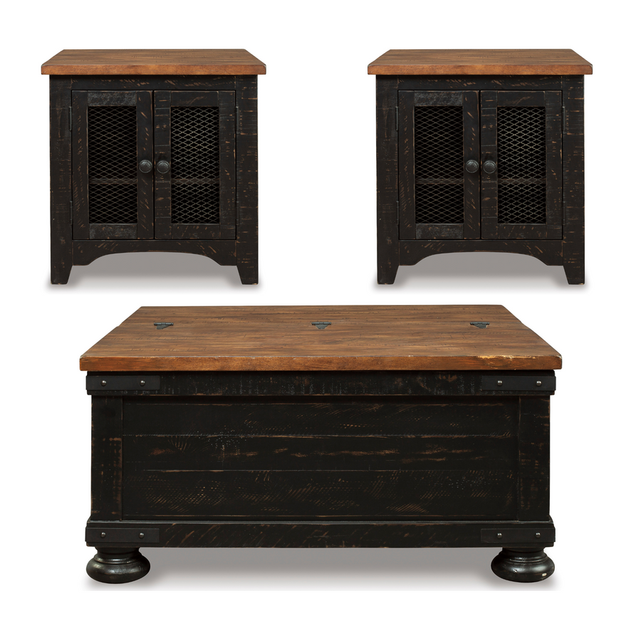To those with an eye for the best in rustic farmhouse living, this two-tone square coffee table with matching end tables doubles up on form and function. Clever split style design pairs a spring lift top with hinged lid revealing a handy storage compartment. Designer touches include plank-effect styling, distress marks and industrial brackets for added character.