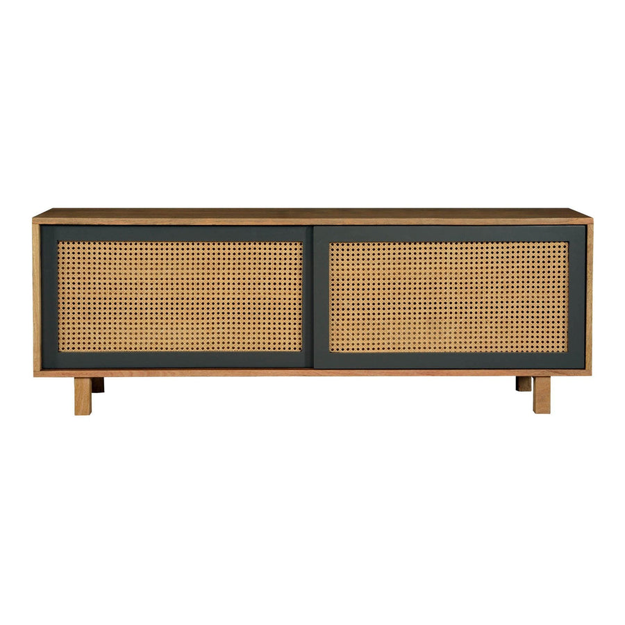 A stylish combination of solid mango wood and woven cane give the Ashton Media Console a fresh contemporary style. Two black-framed doors of woven cane slide open to reveal shelving for your home media collection or sound system. The 55" width makes it suitable for a large flat screen TV.