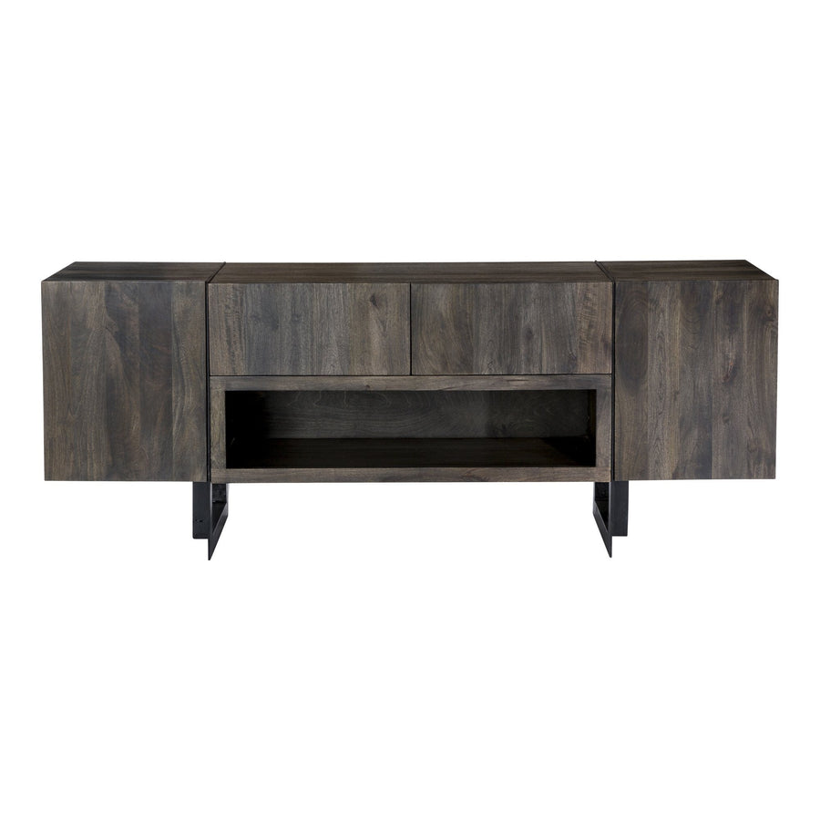 A contemporary entertainment cabinet with a transitional design for any decor. Featuring two large drawers, two doors with shelving, and an open compartment for audio-video components, this unit will keep your entertainment area neat and tidy. Crafted from solid wood and black, powder-coated iron for top-notch quality.