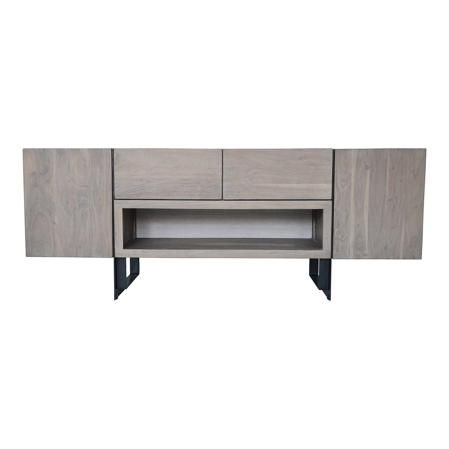 A contemporary entertainment cabinet with a transitional design for any decor. Featuring two large drawers, two doors with shelving, and an open compartment for audio-video components, this unit will keep your entertainment area neat and tidy. Crafted from solid wood and black, powder-coated iron for top-notch quality.