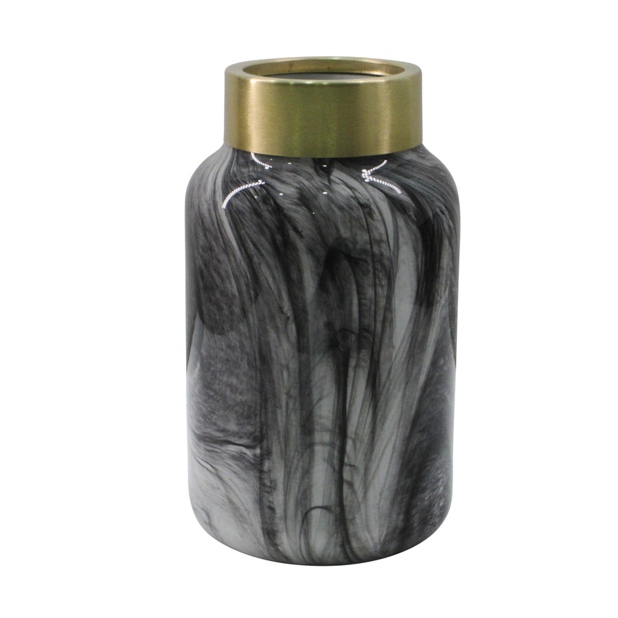 GLASS 10" VASE W/ GOLD RIM, BLACK