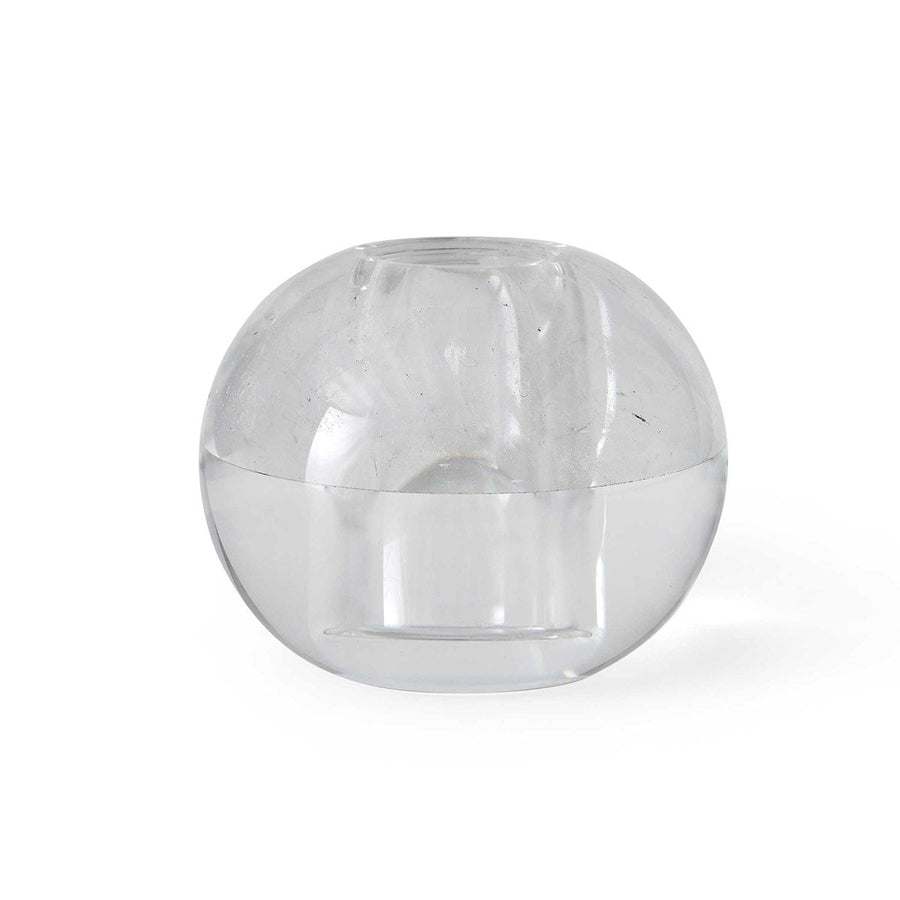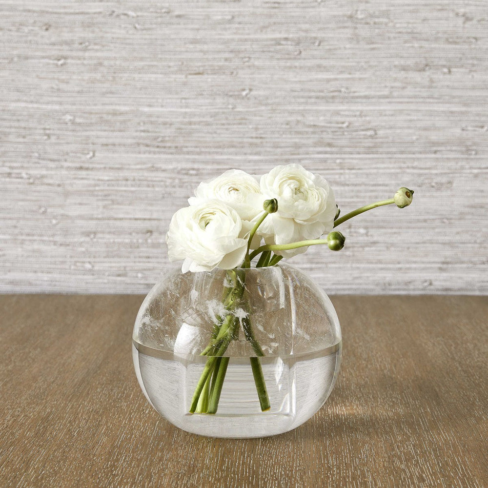 With a top half of clear optic crystal and a base of engineered quartz, this vase is all about the plays of light. Rays pass through the crystal, then reflect, refract and sparkle along the occlusions in the quartz. No wonder occlusions are called fairy frost. The perfectly smooth sphere is pierced by a polished center column for florals but can be displayed empty for pure drama.