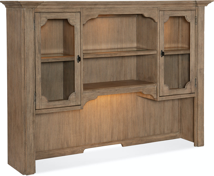 With a casual attitude and a sun-washed ambience inspired by the Mediterranean island for which it is named, the Corsica Credenza Hutch is crafted of Acacia Veneers with a wire-brushed, artisan light natural finish with reclaimed character. Stylish details include burnished bronze pulls, crown molding around the top and scallop-like shaping on the door frames and shelving. Two wood-framed glass doors with one adjustable wood-framed glass shelf behind each door, and one adjustable wood-framed glass shelf in the center area, along with a task light and one light in each section at the top. Recommended to be used with the 5180 Corsica computer credenza.