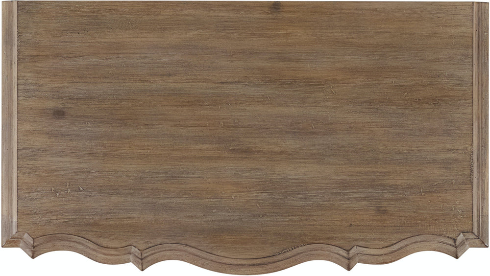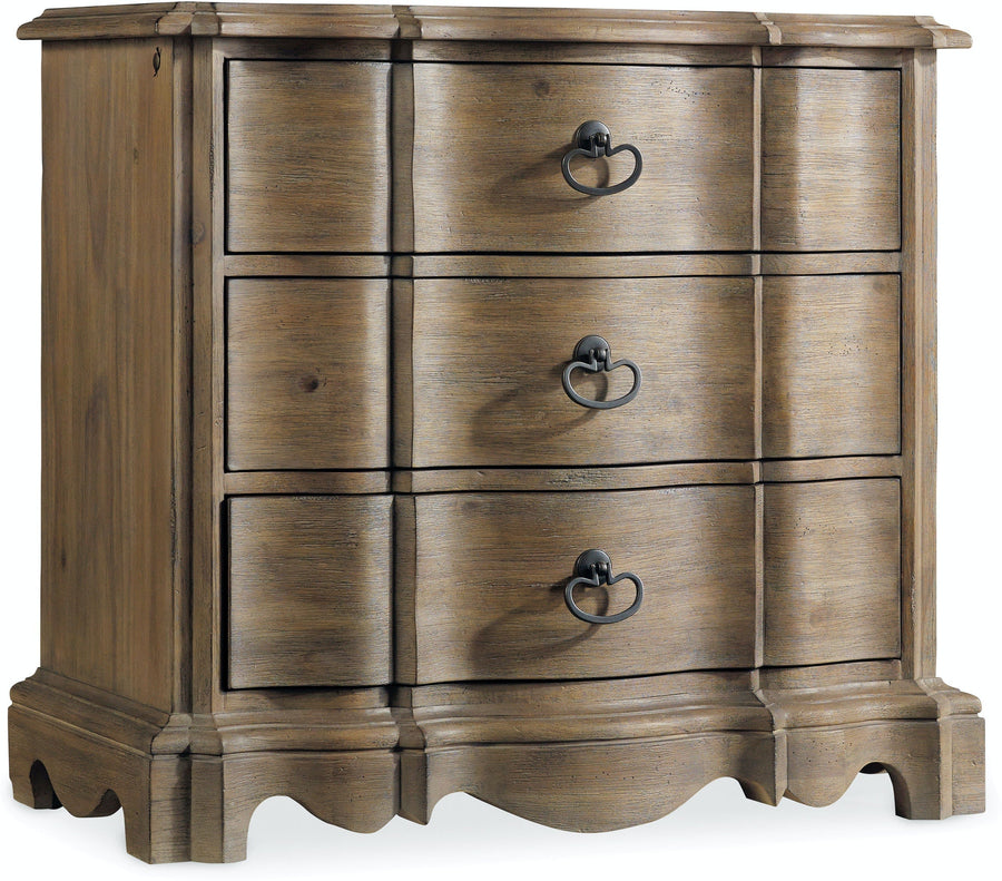 Graceful architectural elements of Italian, French and Belgian origin come together on the shaped silhouette of the Corsica 3-drawer nightstand with a scalloped base and ring-shaped burnished bronze hardware. The timeless nightstand is made casual by the wire-brushed, artisan natural finish with a reclaimed character on exotic beautiful Acacia wood, known for its tactile hand, knots and organic color variations in serene organic hues of gray, rose and natural. The top drawer is felt-lined, and the bottom drawer is cedar-lined. A touch light that illuminates from the bottom of the nightstand offers ambience.