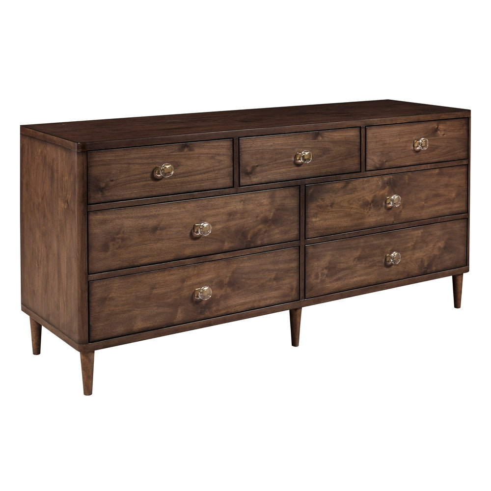 Mid-century modern dresser design offers maximum style with minimalist flair,Base dresser only; optional matching dresser mirror sold separately,Warm brown knotty walnut veneer offers an authentic upscale retro-vintage look,Custom hardware features brushed gold back plates and acrylic pulls for a elegant touch,Crafted with select hardwood, manufactured wood, and knotty walnut veneers for longevity,Some assembly necessary if adding the optional matching dresser mirror, sold separately