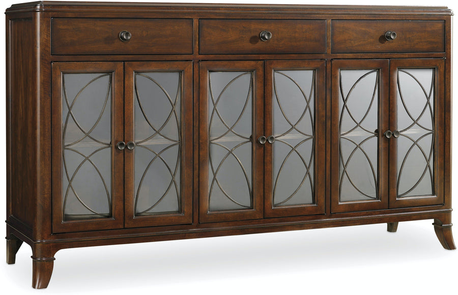 Crafted in highly figured Walnut Veneers with lovely metal fretwork over wood-framed glass doors, the Palisade Buffet is a classic beauty with a fresh modern flair. As functional as it is fashionable, the buffet has two outside drawers with drop-in felt liner and one center drawer with a silver tray. There is one adjustable wood shelf behind each pair of doors, for a total of three shelves.