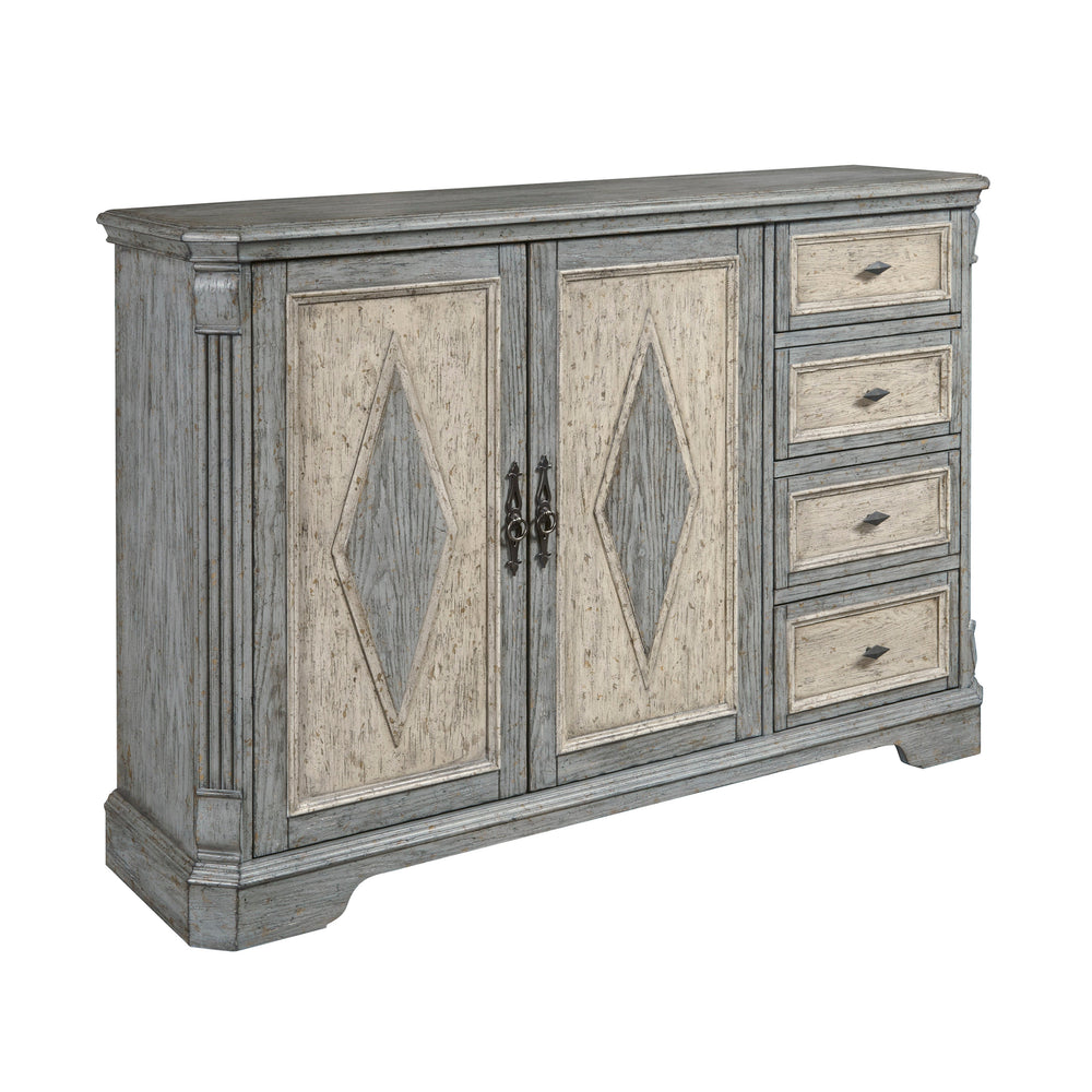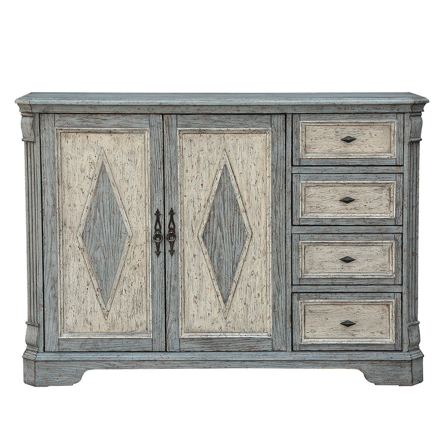 Farmhouse, modern design with rustic elements, offer style and function,Four drawers set on side-mounted full-extension glides and two doors open to reveal plenty of storage wherever it's needed,Heavily distressed Robin's Egg blue painted finish combines with an equally distressed cream finish on the door and drawer faces,Ornate hardware adds a traditional touch,Constructed with poplar wood for stability and ash veneer for a real wood feel,No assembly required