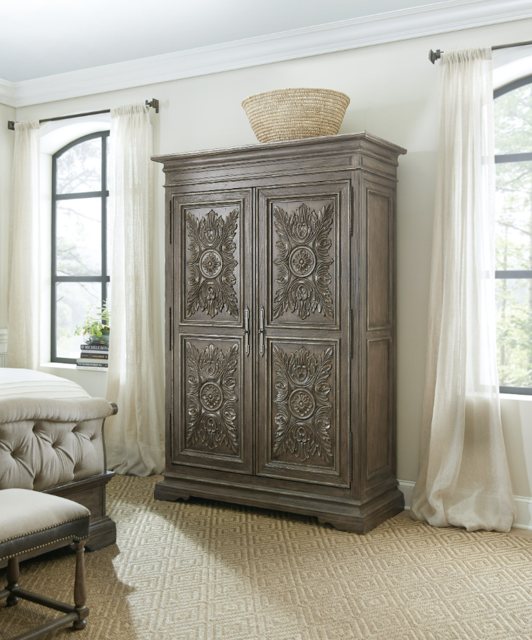 Inspired by America's great mansions of the Gilded Age, the Woodlands Wardrobe is adorned with bold decorative moldings and carved details that make it a stunning and spectacular focal point for any room. As functional as it is fashionable, the wardrobe features two doors, six drawers and two shelves with partitions to create nine cubby storage areas, along with a mirror on the inside of the door. Crafted of Poplar and Hardwood Solids with Quartered Oak Veneers, the wardrobe is finished in the versatile Heathered Lambswool, a serene mid-tone that walks the line between gray and taupe.