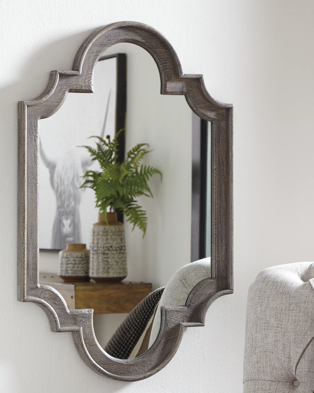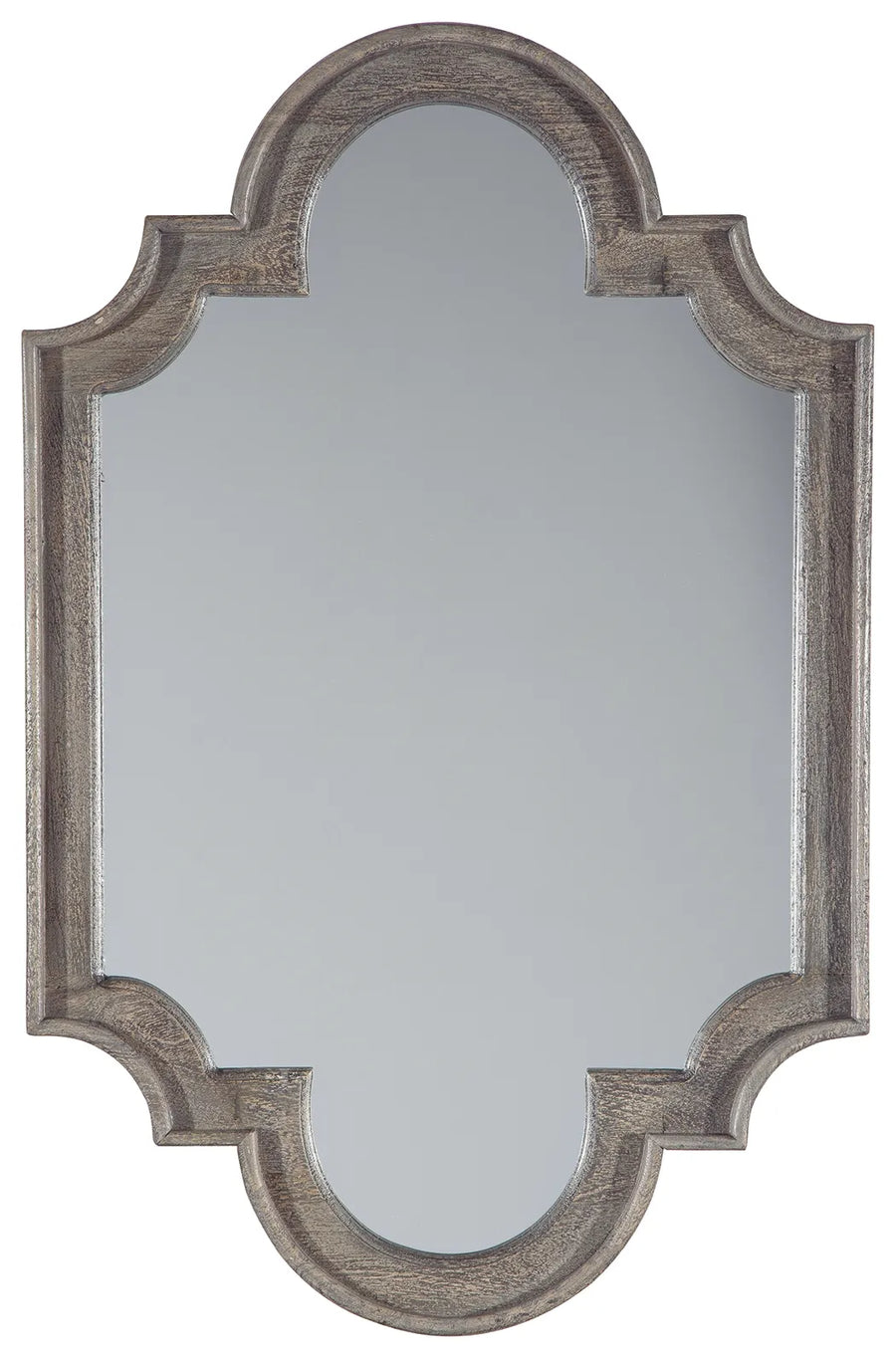 Take a fresh turn on tradition with this striking accent mirror. Richly turned keyhole wood frame is beautified with an antique gray finish with so much allure. The fact that it can hang vertically or horizontally adds to its possibilities.