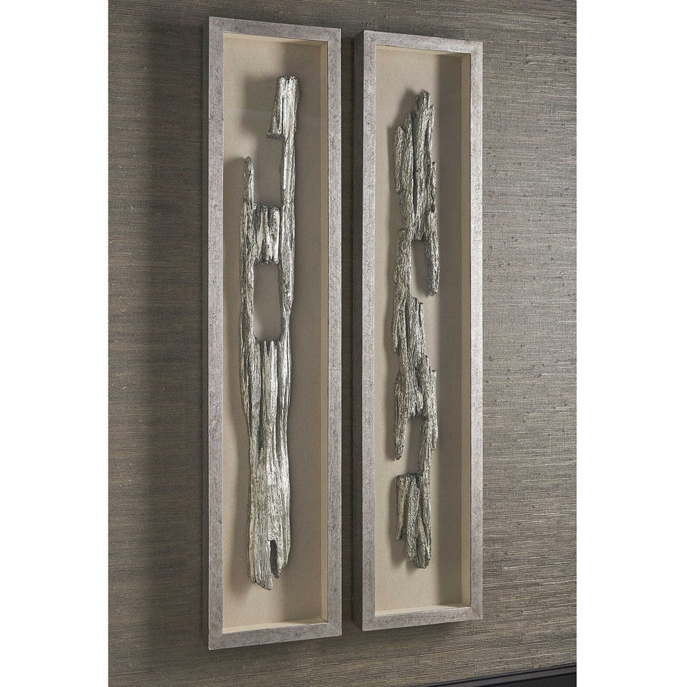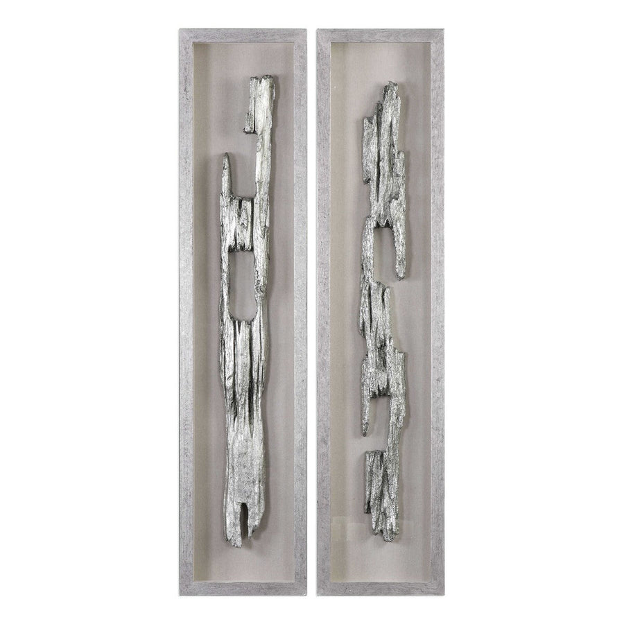 Replicated from old fence posts, finished in bright metallic silver, placed on a linen backing with a hand applied silver leaf framed shadow box. May be hung horizontal or vertical.