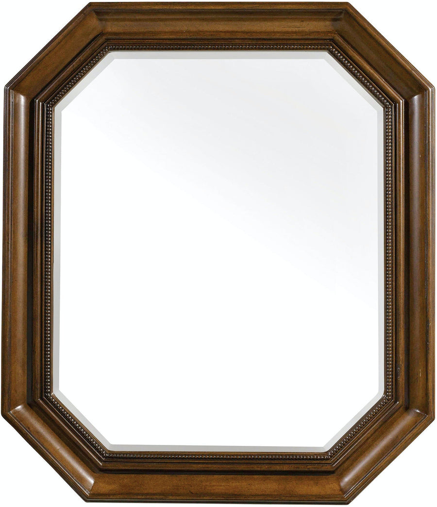 Elegant and effusive with a stylish energy, the octagon-shaped portrait mirror will add a punctuation mark over any dresser, console or chest. The soft casual finish over Pecky Pecan veneers gives a rustic, authentic look, and the intricate beaded wood molding inside the frame adds a designer detail. D rings and support brackets for hanging.