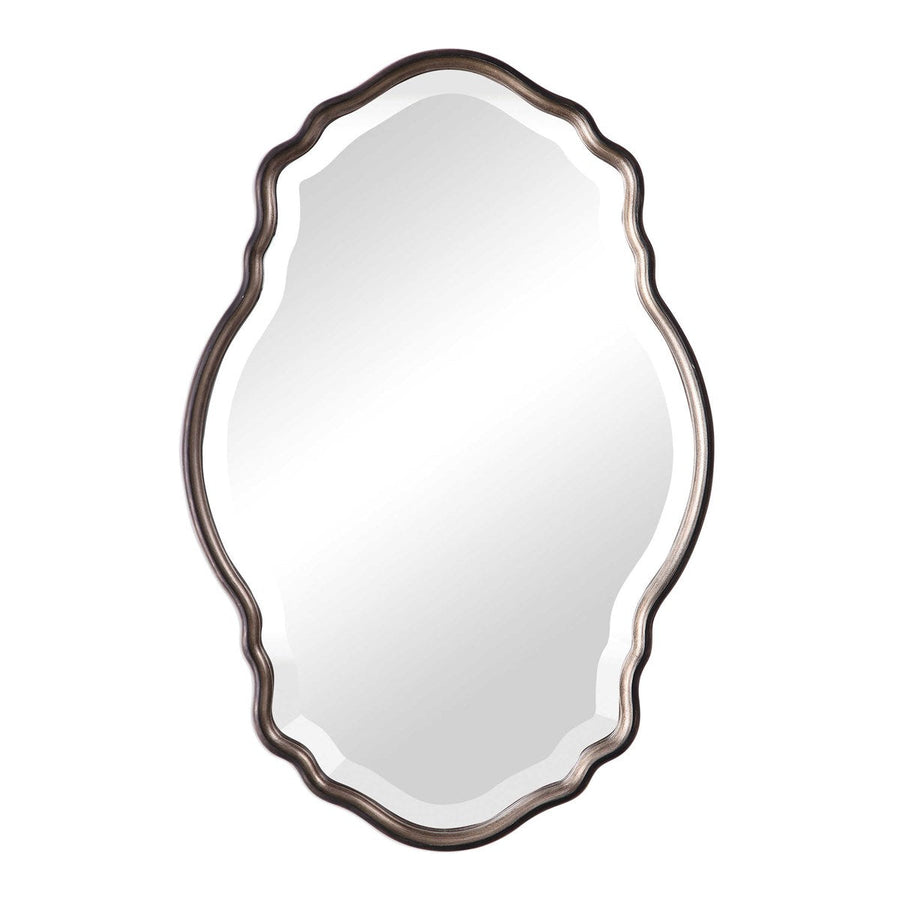 Graceful curves add elegance to this unique mirror. The frame features an antique silver champagne finish, accented with a dark bronze outer edge. The mirror has a 1.25" bevel. May be hung either vertically or horizontally. Also available in gold, W00525.