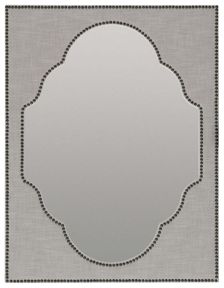 Tactile and eclectic, the Nourmand Mirror is wrapped in the soft gray Antwerp Linen and accented with decorative nailheads. Mirror comes complete with mirror hooks and wood brackets to attach to the dresser.