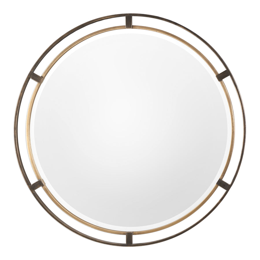 This Iron Frame Features A 3-dimensional Design With An Outer Overlapping Frame Finished In A Distressed Rustic Bronze, Accented With A Lightly Antiqued Gold Center. Mirror Features A Generous 1 1/4" Bevel.