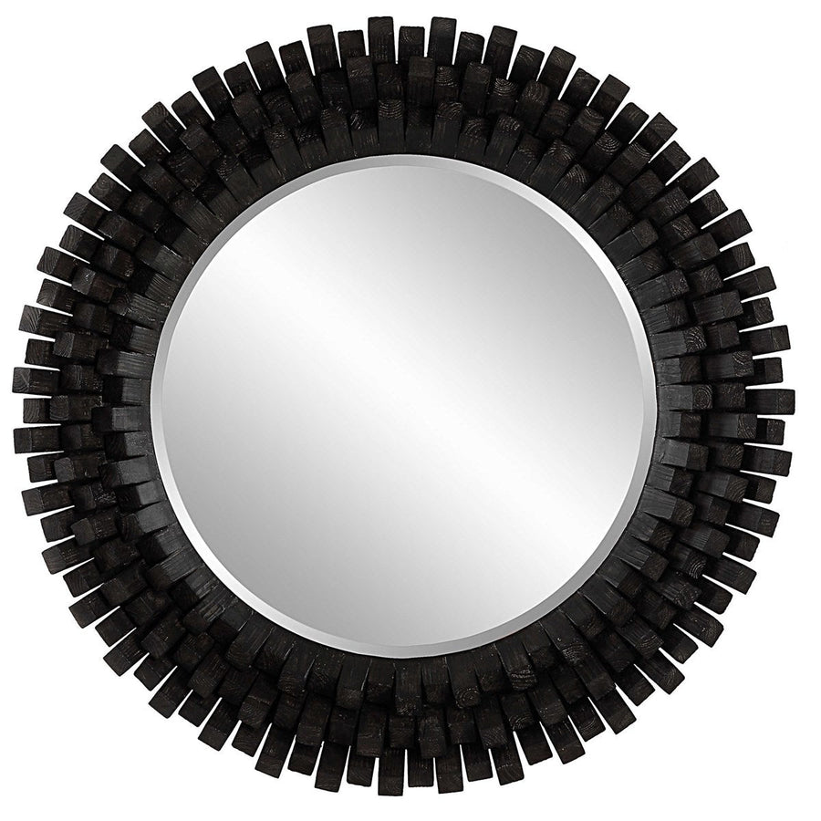 This round wood mirror has a contemporary rustic flair by featuring angled pillars of solid wood stacked in alternating heights for a dramatic and unique display, finished in an ebony stain with a subtle gray wash. Mirror has a generous 1 1/4" bevel.