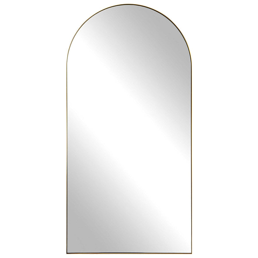 This Oversized Arch Features A Sleek Stainless Steel Frame Finished In A Rich Antique Brass Surrounding A Floating, Polished Edged Mirror.