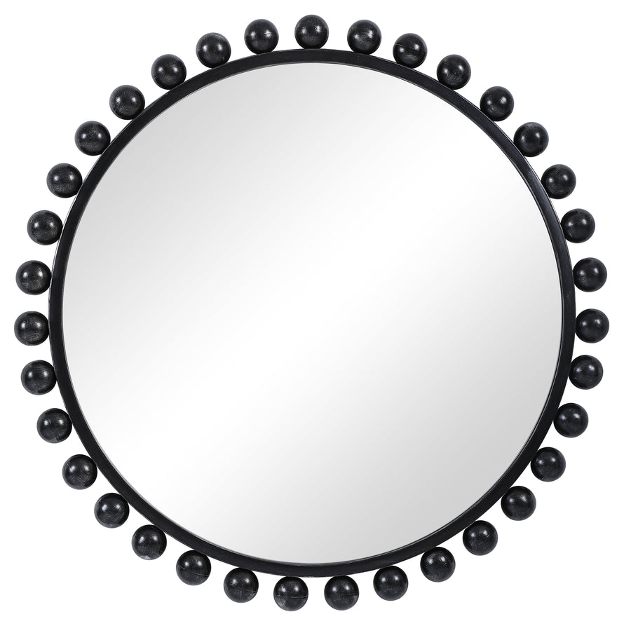This Eye-catching Round Mirror Adds An Upscale Look And Sophisticated Style To Any Room By Showcasing Smooth Iron Spheres That Embellish A Sleek Inner Frame, Finished In A Distressed Black With Subtle Silver Undertones.