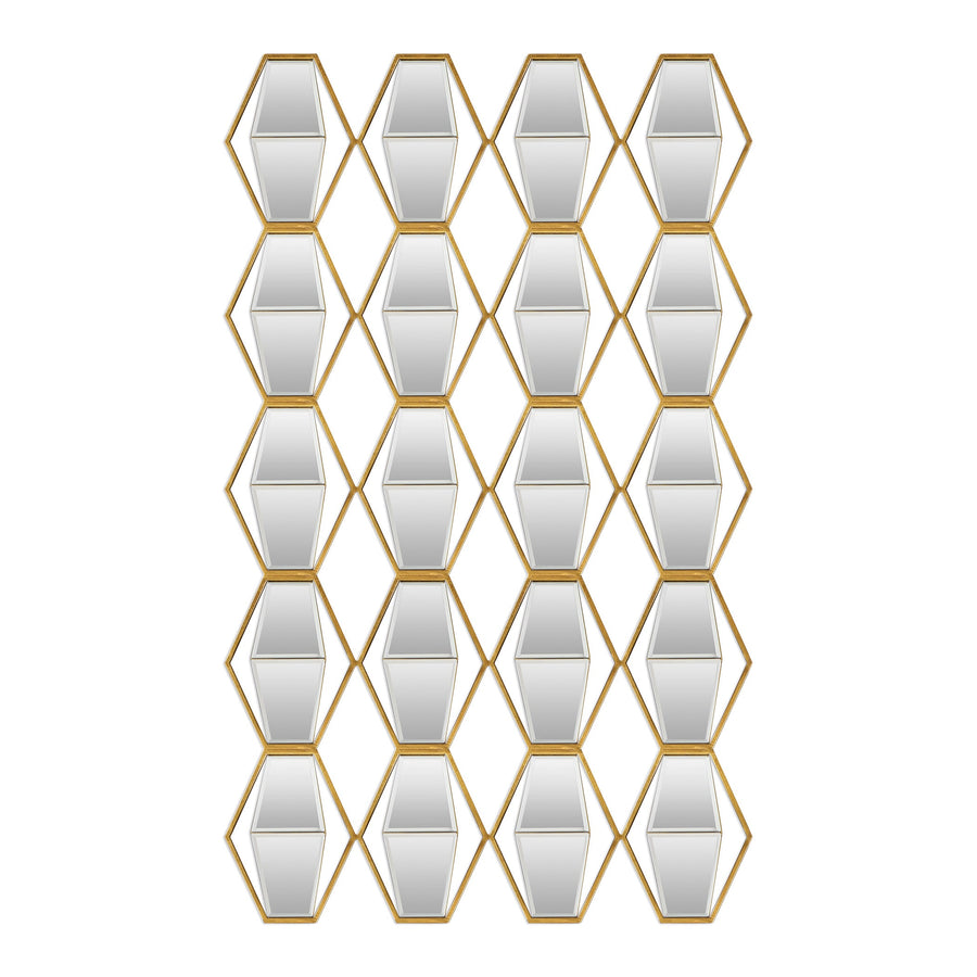 Petite iron frame finished in metallic gold leaf, featuring suspended beveled mirrors in a 3-dimensional angled profile. May be hung horizontal or vertical.