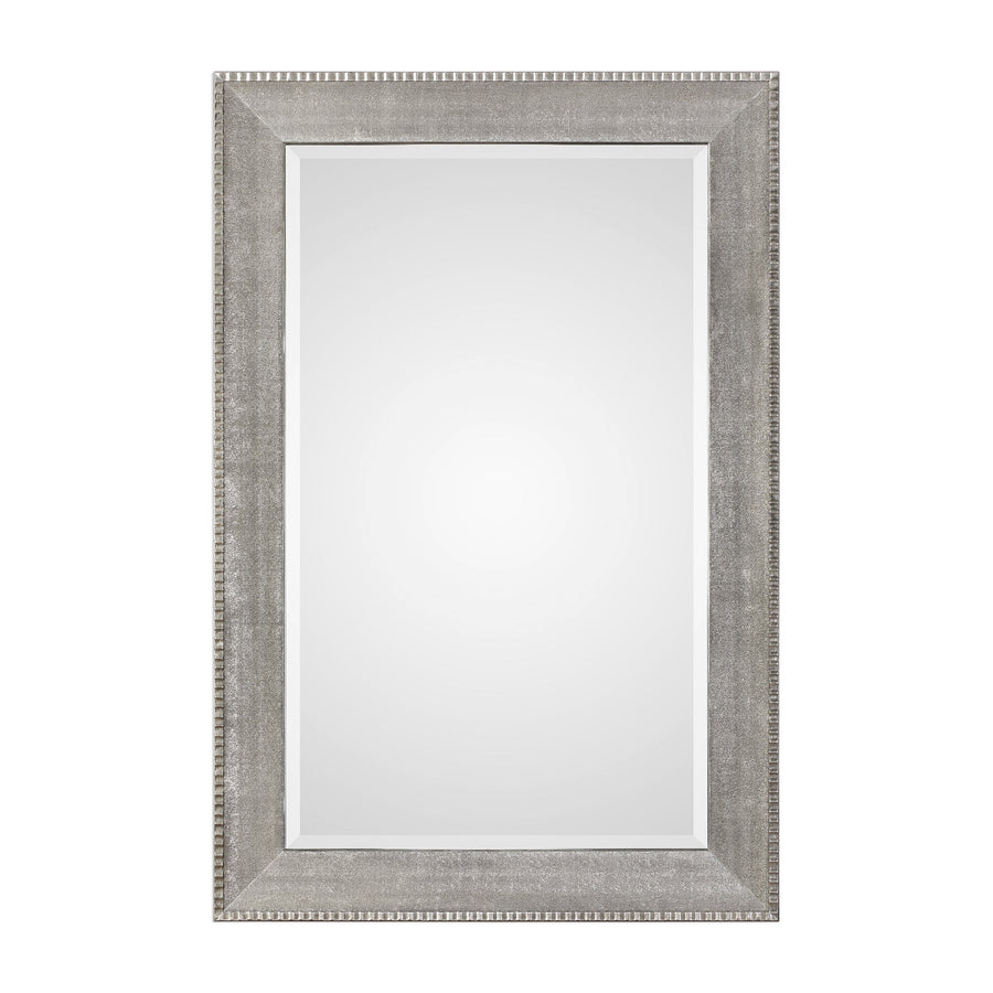 Heavily Textured Sloped Profile Finished In A Metallic Silver, Accented With A Fluted Antiqued Silver Edge. Mirror Features A Generous 1 1/4" Bevel And May Be Hung Horizontal Or Vertical.