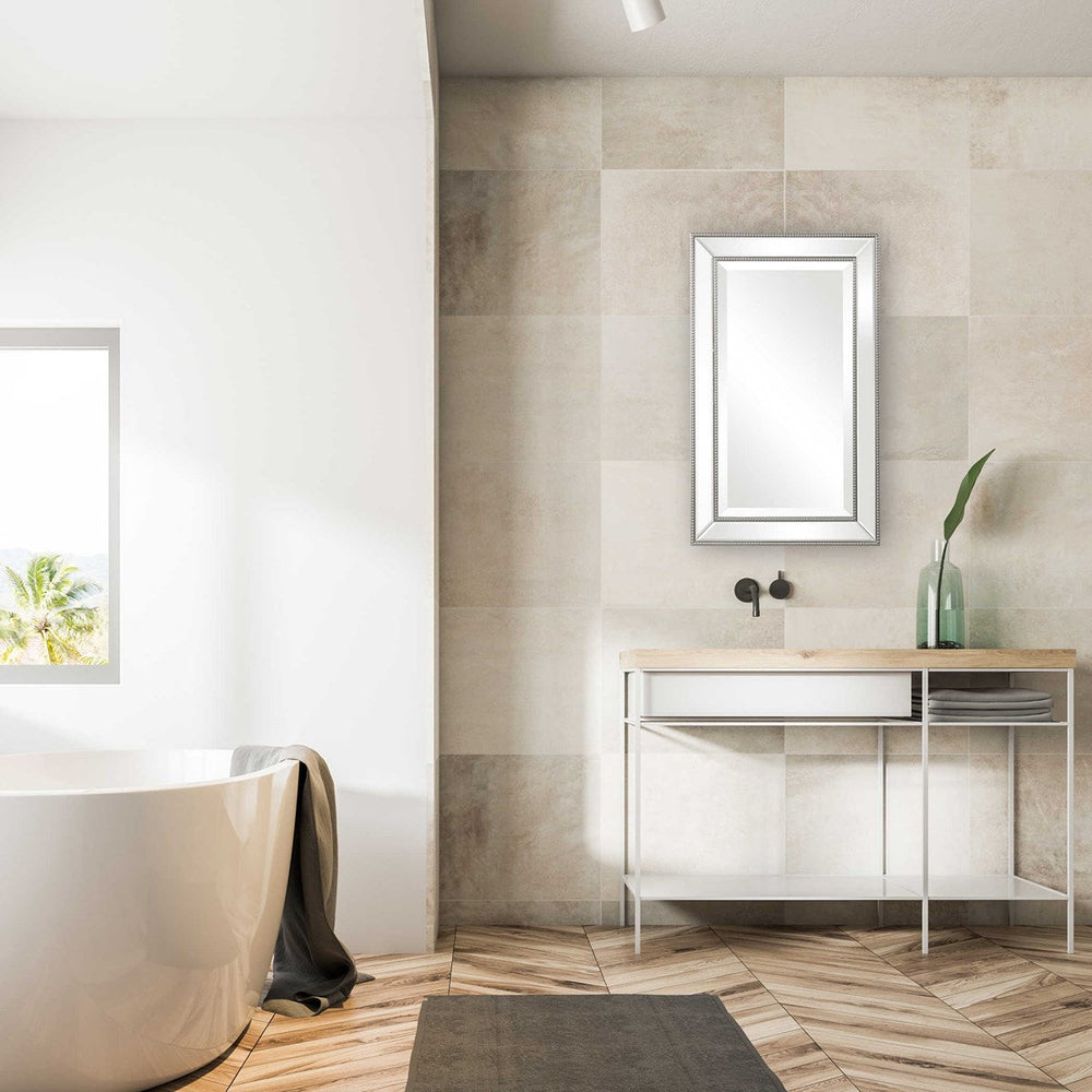 This elegant frame, made with beveled mirror, is accented with warm silver beading, outlining both the inner and outer frame. The center mirror has a 1" bevel. May be hung either vertically or horizontally.