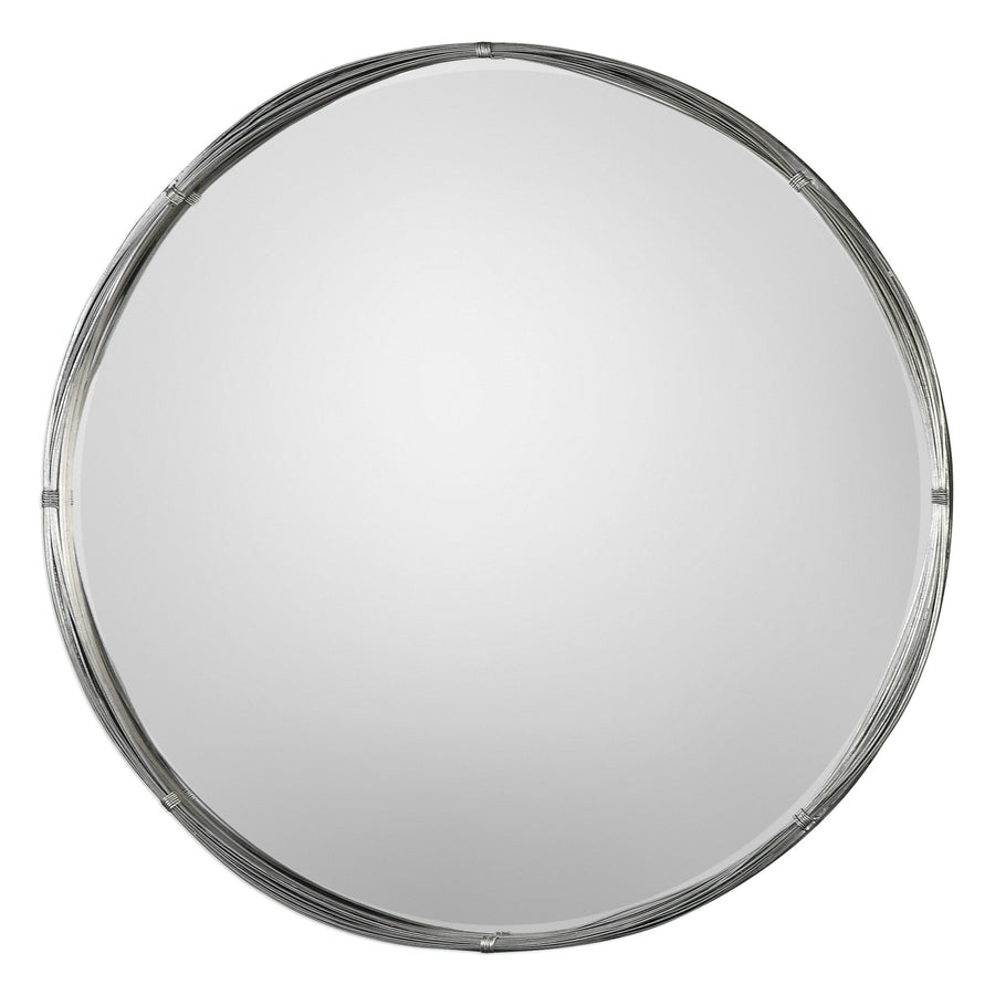 Loose strands of heavy gauge wire are bound by metal coils and hand finished in a lightly antiqued metallic silver leaf. Mirror has a generous 1 1/4" bevel.