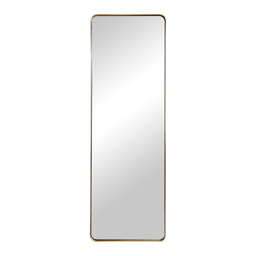 This elegant leaner style mirror keeps it simple and clean with a thick stainless steel strap frame, finished in a plated metallic brushed brass. May be hung horizontal or vertical.