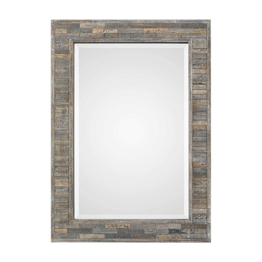Strips of weathered pine, finished in a heavily distressed charcoal blue, with natural undertones, create an aged wood frame. The mirror has a 1" bevel. May be hung either vertically or horizontally.
