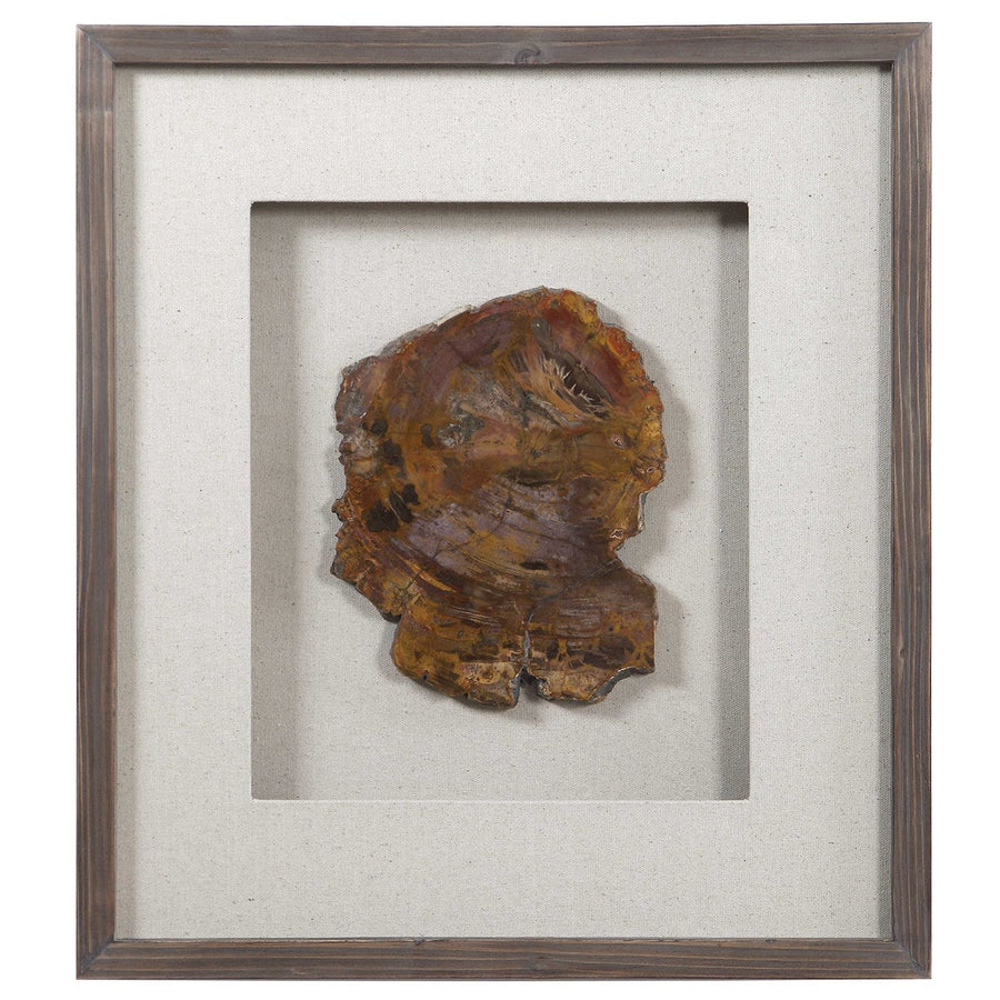 This shadow box style wall decor features a polished slice of petrified wood, set under glass in a dark walnut finished fir wood frame with a light beige linen background. Due to the authentic nature of the wood, each will vary in color and size.