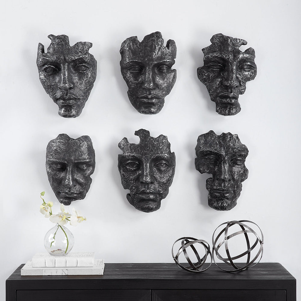 Inspired by works from modern art galleries, these masks are handcrafted with a sculpted look in a patinated steel gray finish with noticeable metallic details and texture.