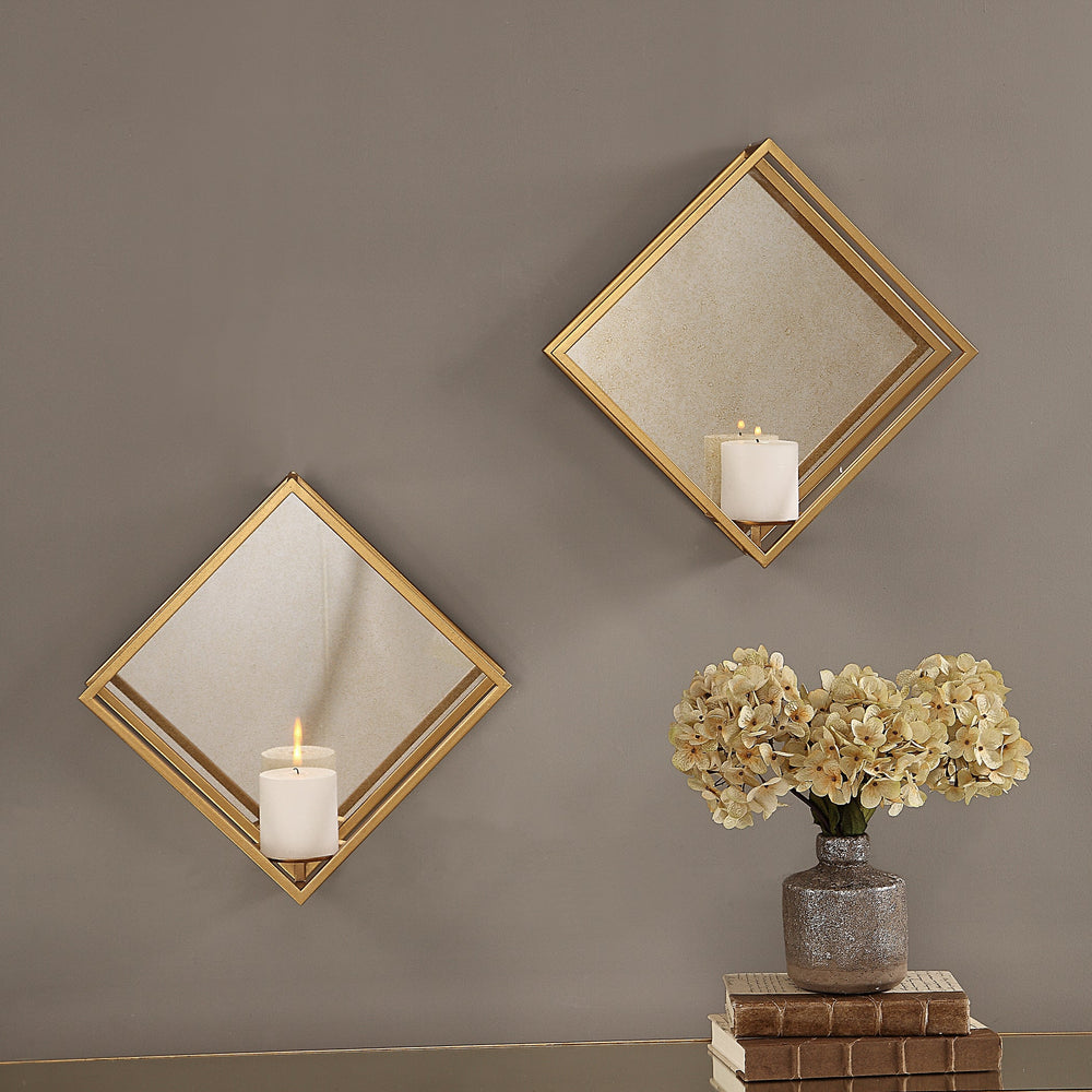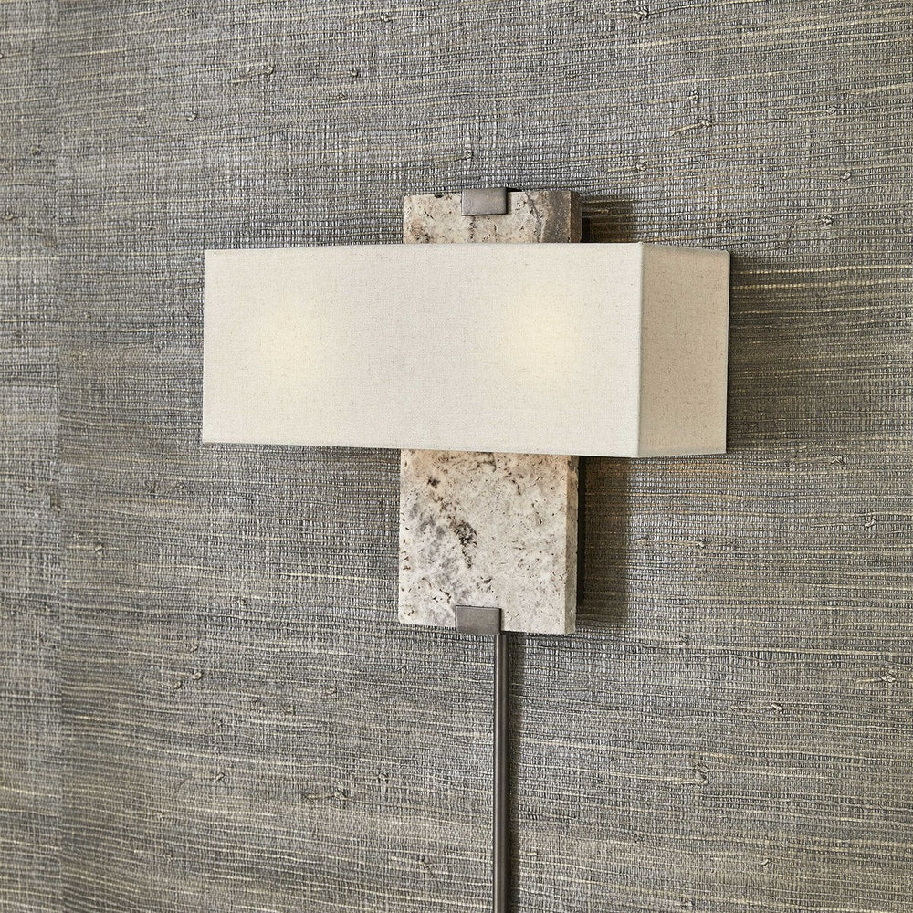 A grey and beige unfilled stone monolith held in place with two metal clips in acid oxidized dark bronze providing a striking backdrop for the clean rectangular shade concealing 2-60 watt max. candelabra sockets. The flexible Seton Wall Sconce can be used for portable installations as it comes with 8' of wire with 3-12" metal cord covers and in-line dimmer switch & plug or can be easily adapted for direct wire installation. Bulbs not included.