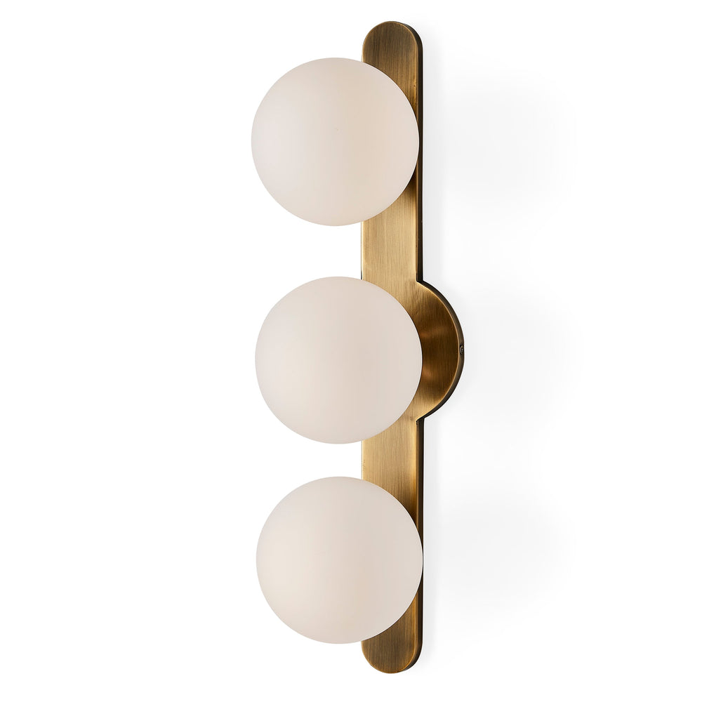 A 3 Light Sconce Designed With Mid-Century Roots Finished In A Warm Antique Brass And Accented With 5" Matte White Opal Globes Yields A Modern Take On Vintage Style. With 3-60 Watt Max Candelabra Sockets For G16.5 Bulbs.