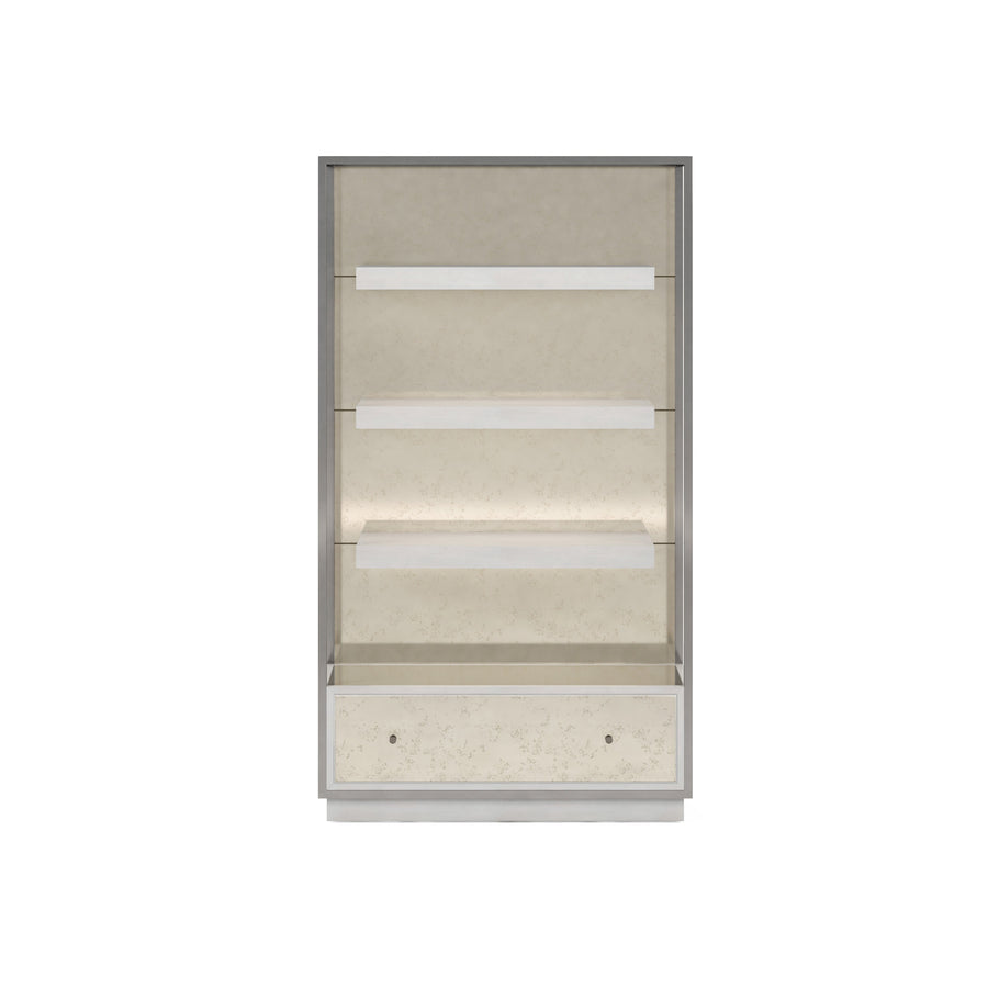 | Features | Three (3) fixed floating shelves, One (1) drawer for storage, Three-way touch LED lighting, Antique mirrored back and drawer front, Petite brushed nickel hardware, Open metal frame, Inset plinth base |