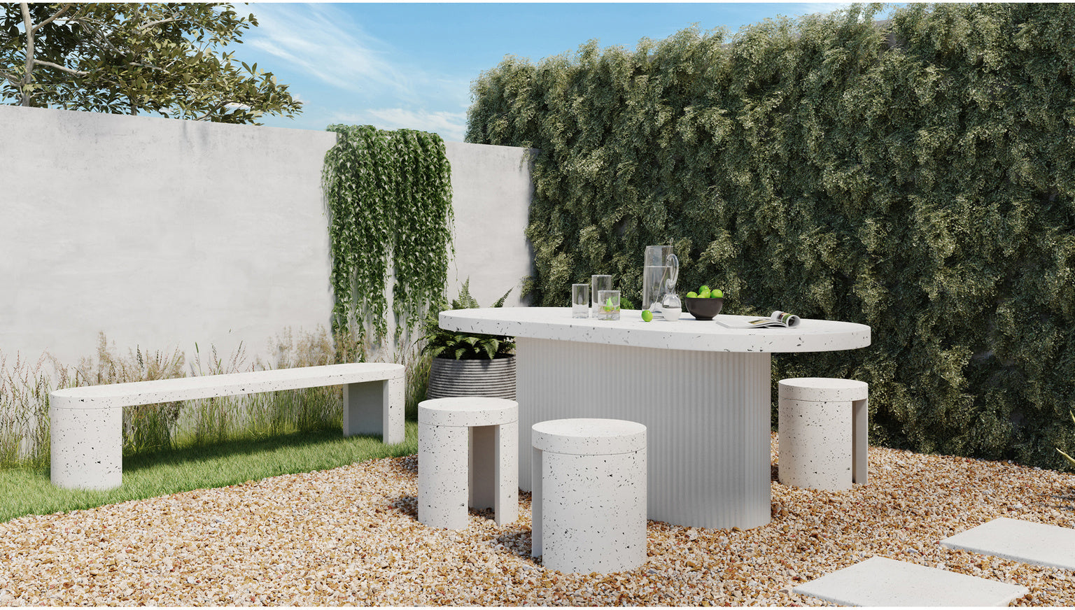 Perfect for an open-plan garden or patio setting, this spacious bench’s rounded geometric shape contrasts so well within an organic environment. Smooth and minimal, it is constructed in a unique concrete terrazzo composite that focuses on the natural beauty of minerals with its speckled, contemporary aesthetic.