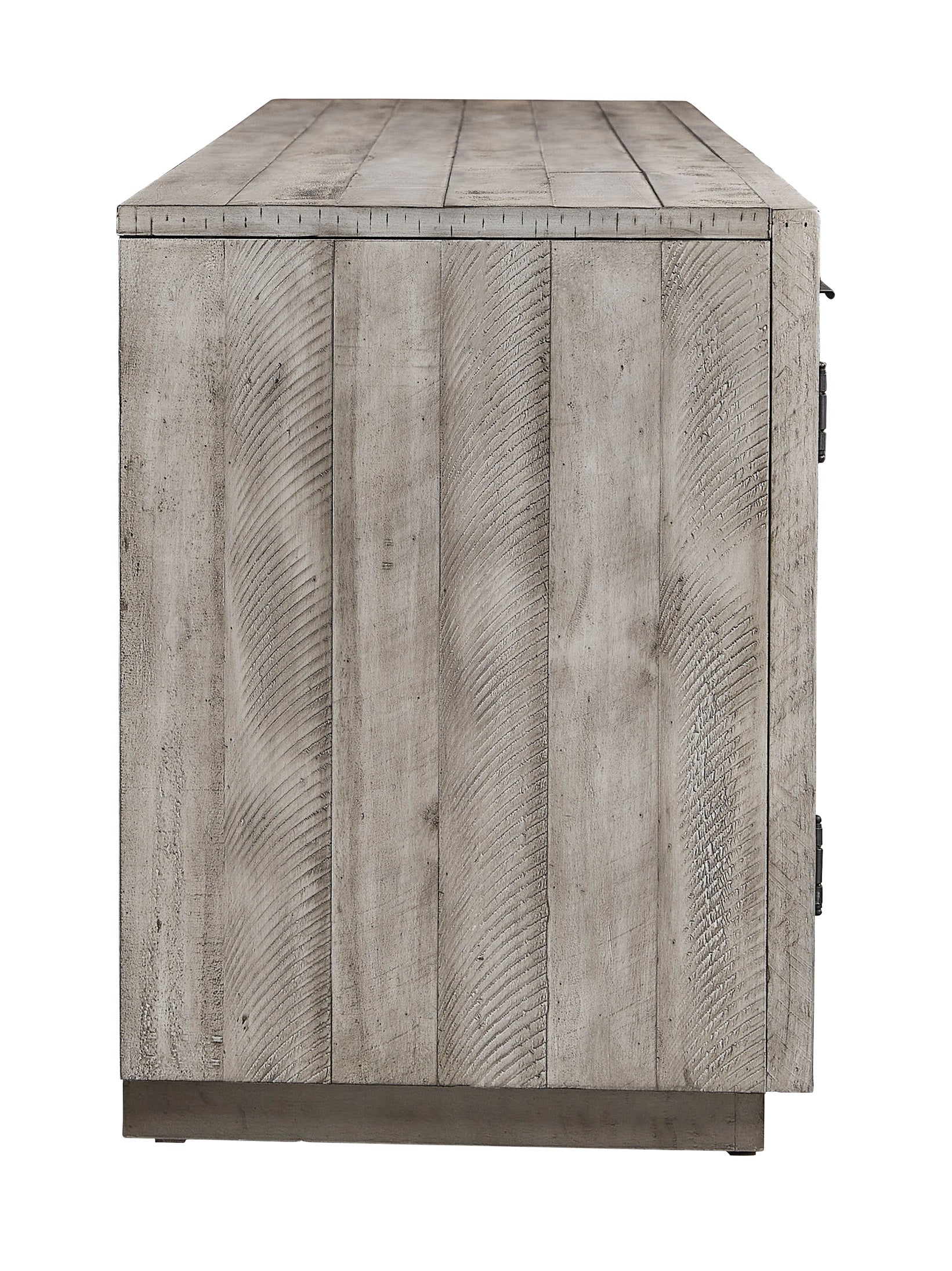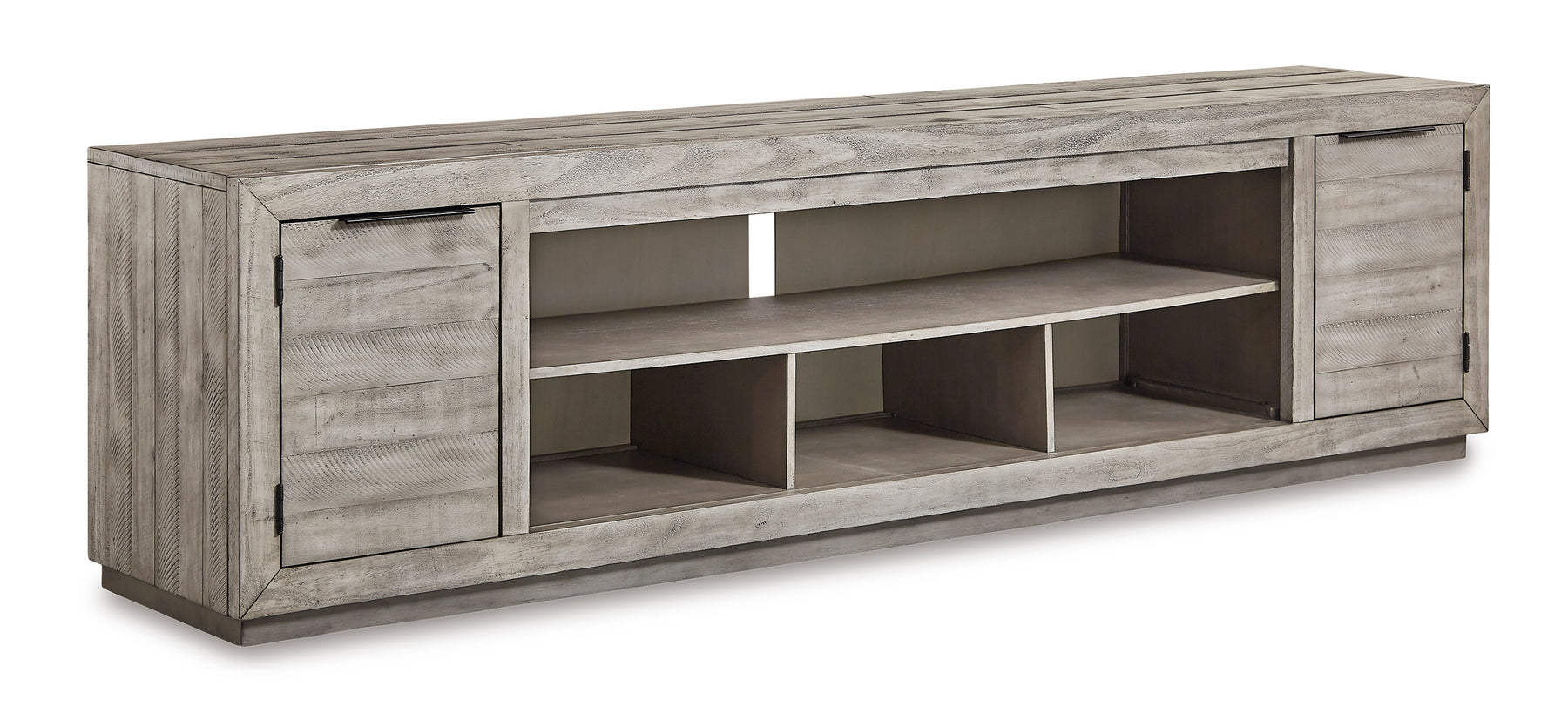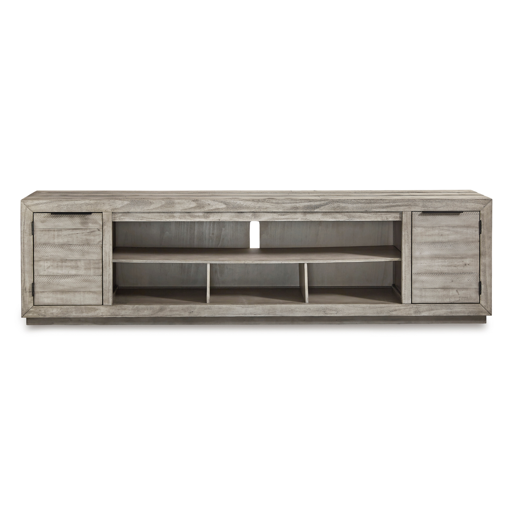 Balancing chic flair with a relaxed sensibility, the Naydell extra-large TV stand strikes just the right tone for rustic sophistication. Beautifully clean lines are subtly enhanced with relaxed distressing and saw marks for authentic barn wood character. You're sure to love the convenient open style for easy access to media equipment and accommodating pretty home accents.