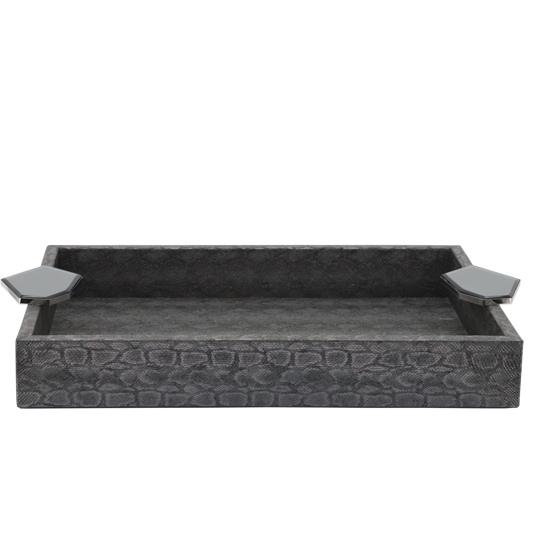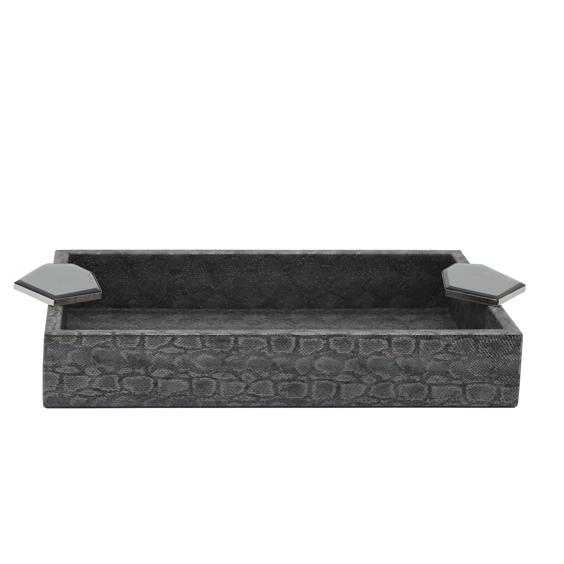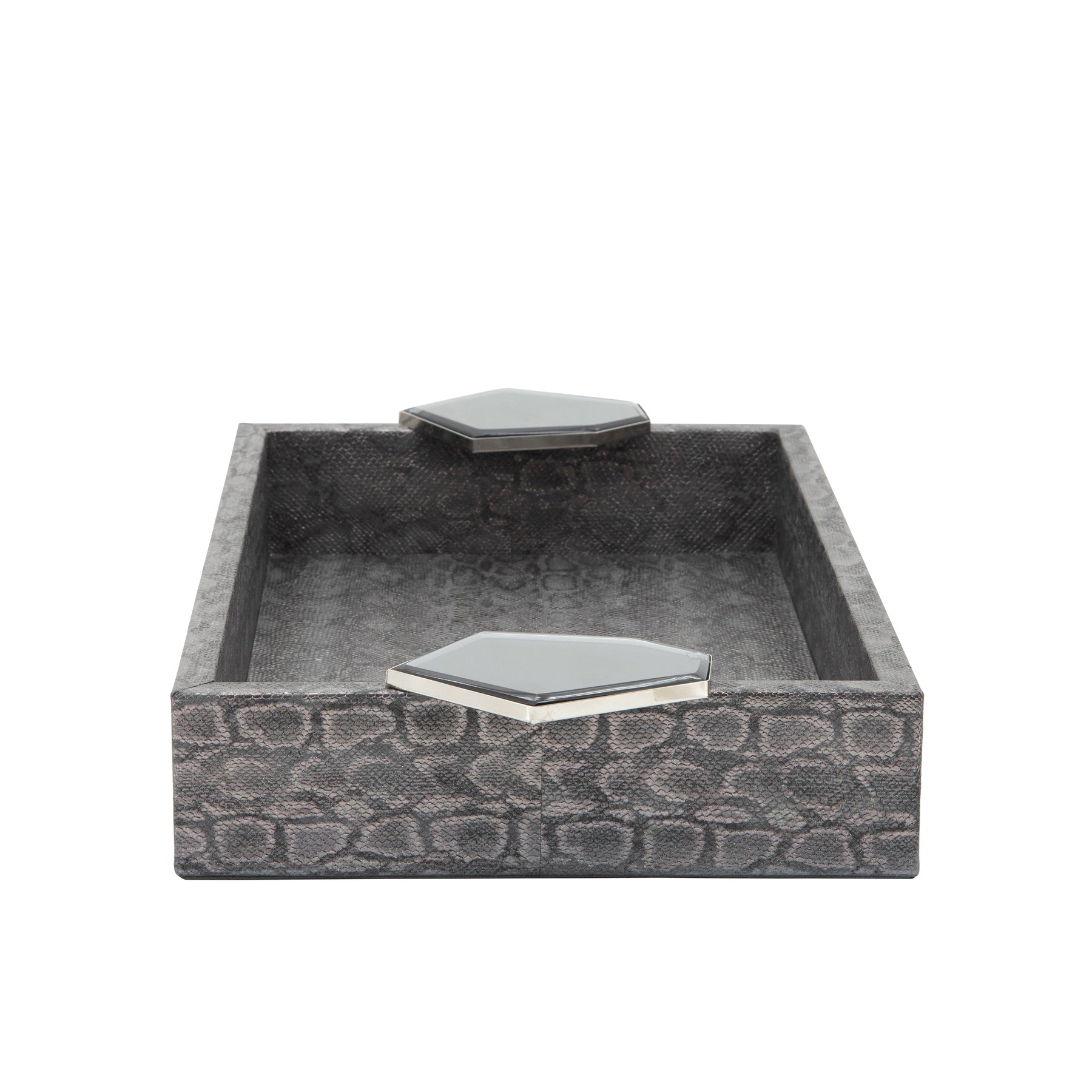 S/2 WOOD 14" FAUX LEATHER TRAYS, GRAY
