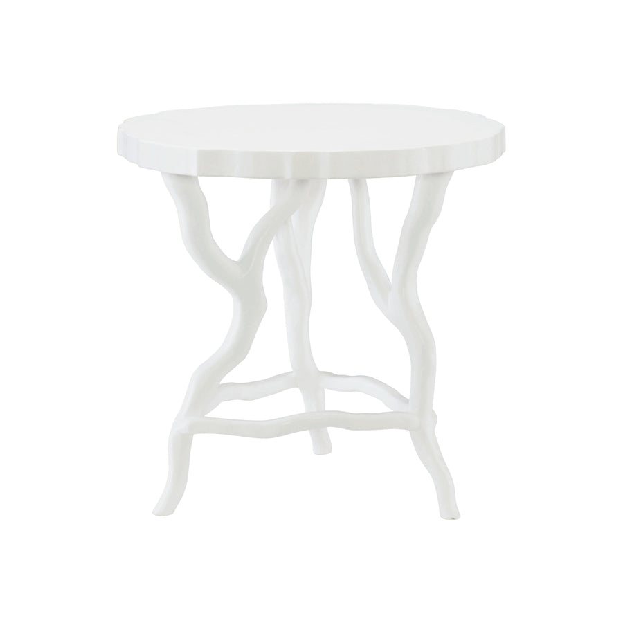 Crafted from cast resin over a steel frame, the Arbor chairside table artfully juxtaposes modern materials with natural forms. Finished in a Chalky White, the faux bois base evokes tree branches, while the top echoes the shape of a cross-cut tree trunk slice. The unique character of this asymmetrical design brings movement and flow.