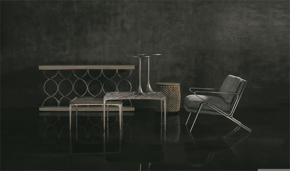 Bernhardt Interiors offers an eclectic array of artistic tables with a distinctly modern styling. Crafted from cast aluminum in a graphite finish, the Circlet bunching table features two tulip tables with slender stems connecting to a central base. With its smooth, fluid design and sleek profile, this piece offers shape and movement.