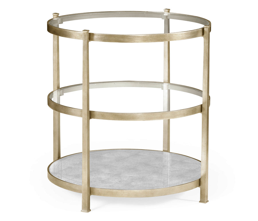 Wrought iron three tier round side table with an antique silver finish, the upper shelves with inset glass panels, the undertier with églomisé glass.
