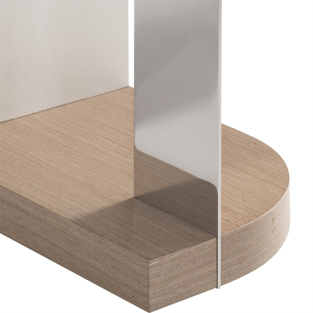 Modern art informs the chic and unique Modulum side table. A shaft of stainless steel reflects the rounded corners and sharp lines of the Calder-esque design, while a wood panel in an Adobe faux finish supports the opposite side. The metal panel pierces the table's top as well, showcasing a sharp signature for the Modulum collection.