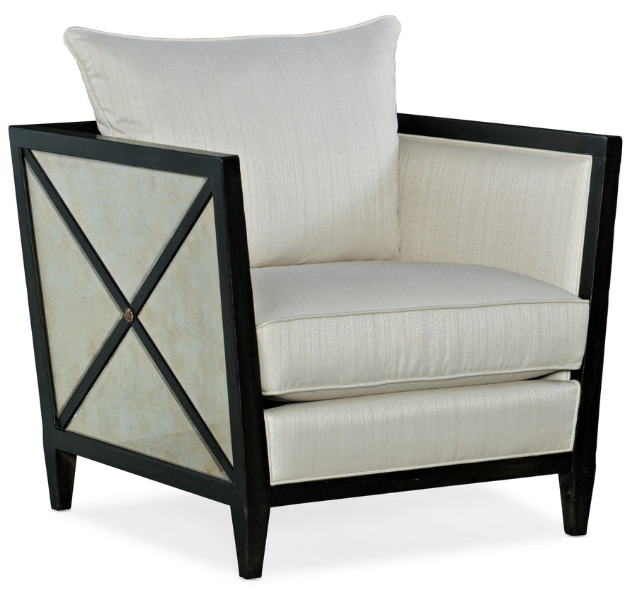 Sure to become a favorite place for refuge at the end of the day, the Joli Lounge Chair is a striking silhouette with a classic X motif over a shimmering, serene mirrored eglomise surface on the back and sides and a gold medallion inside the X design. The exposed wood frame and legs are finished in Noir, a dark black painted finish with rich brown undertones. With a loose pillow back, Joli is upholstered in Metal Icicle, a performance fabric to resist stains and spills.