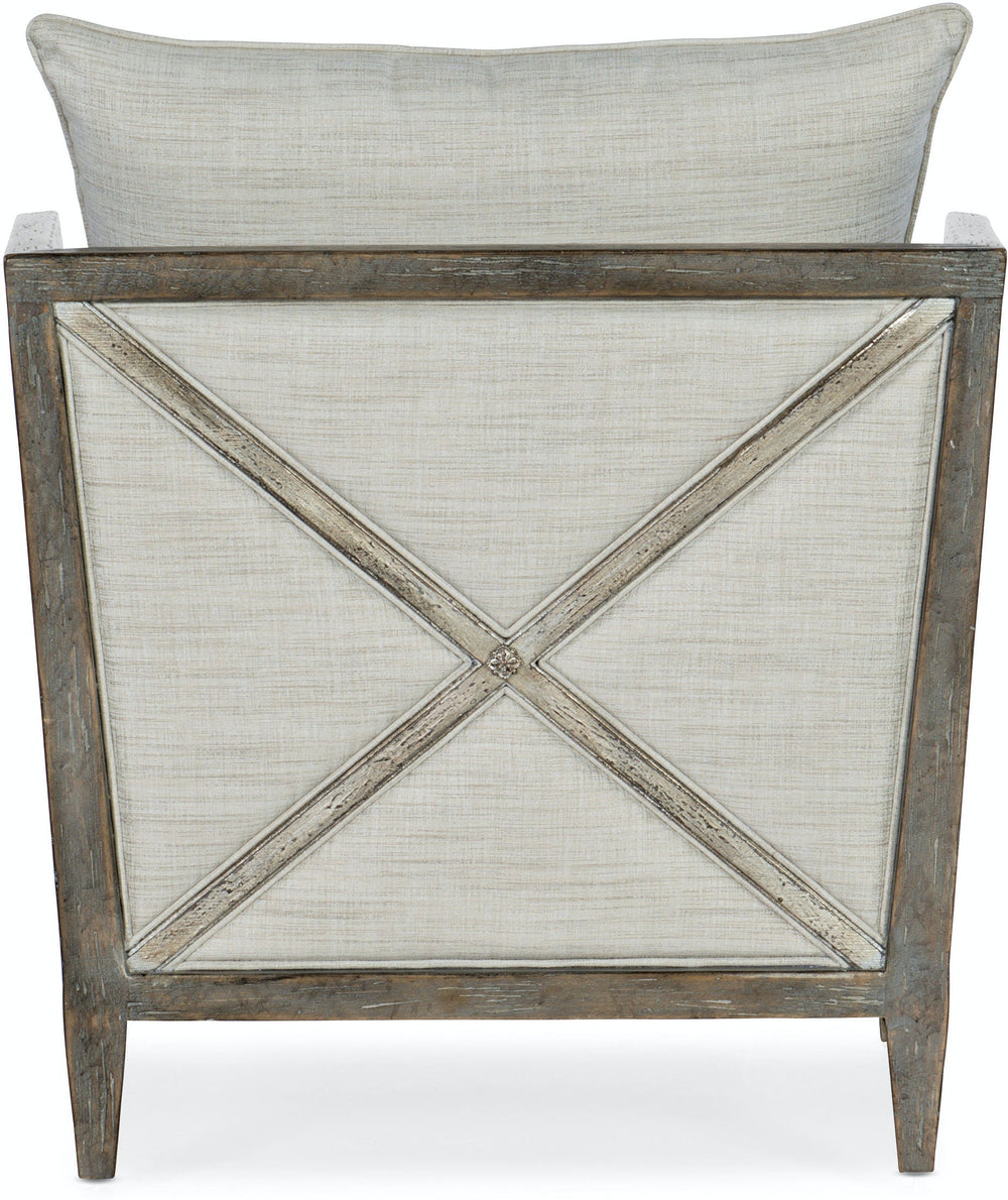 Sure to become a favorite place for refuge at the end of the day, the Sanctuary Prim Lounge Chair is a striking silhouette with a classic X motif over fabric on the back and sides. The exposed wood frame and legs are finished in Quartz Grey, a light wood tone with areas of cool gray burnishing creating a subtle two-tone effect. With a loose pillow back, the Prim is upholstered in Encore Pearl, a performance fabric to resist stains and spills.
