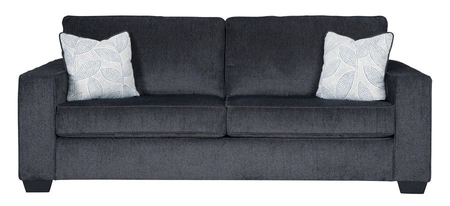 If style is the question, then the Altari sofa is the answer. Sporting clean lines and sleek track arms, the decidedly contemporary profile is enhanced with plump cushioning and a chenille-feel upholstery, so pleasing to the touch. Sure to play well with so many color schemes, this sofa in slate gray includes a pair of understated floral pattern pillows for fashionably fresh appeal.