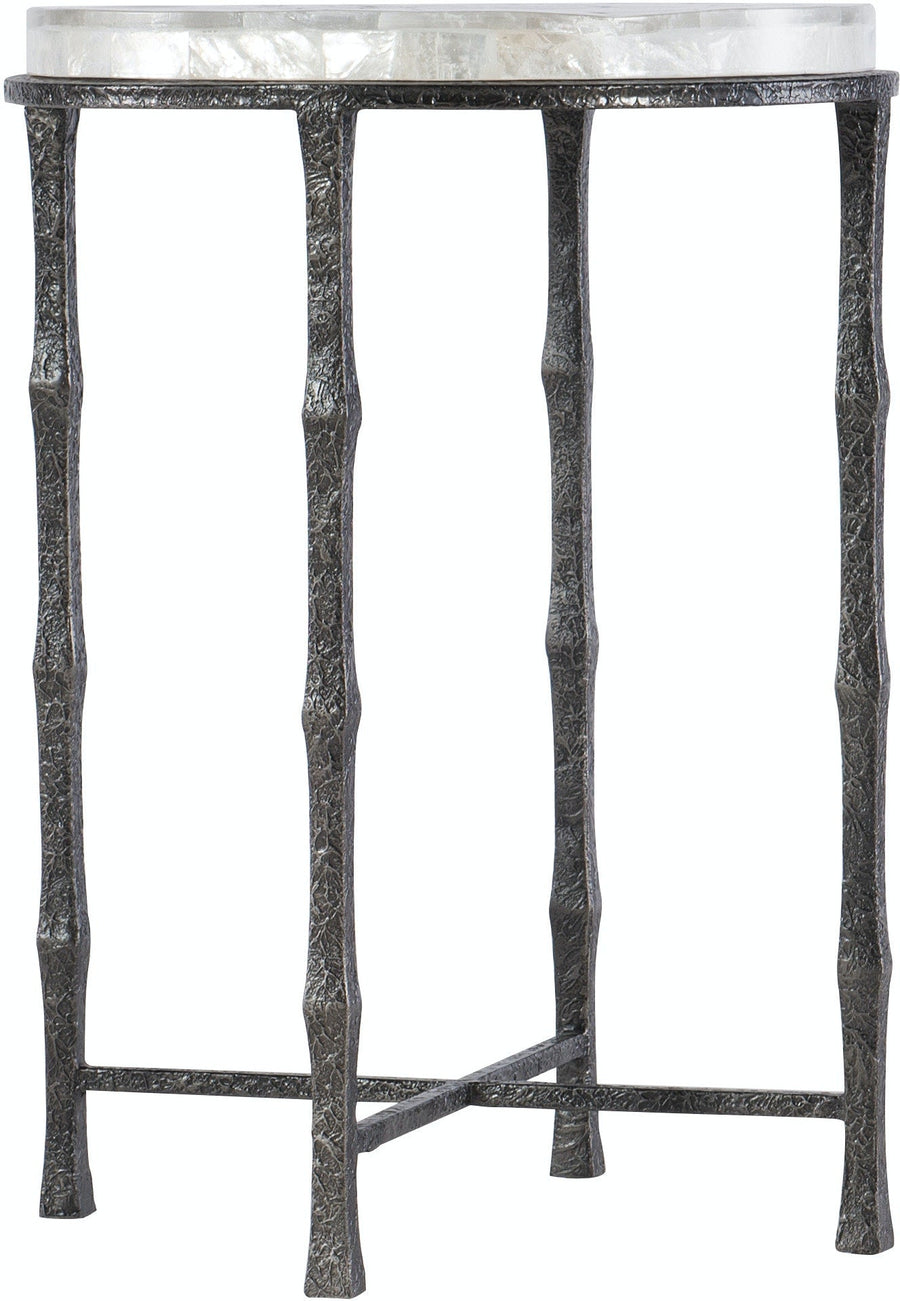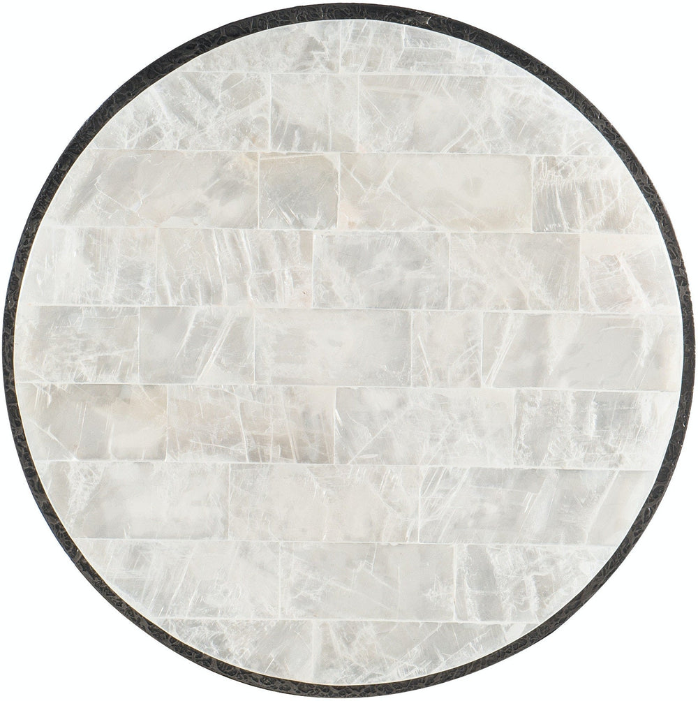 A delightful medley of natural materials and organic color tones, the versatile Surfrider Martini Table has a compact 18 W x 18 D footprint with a Gypsum top in a multicolored blend of whites, creams and beiges and a charcoal-colored distressed metal frame.