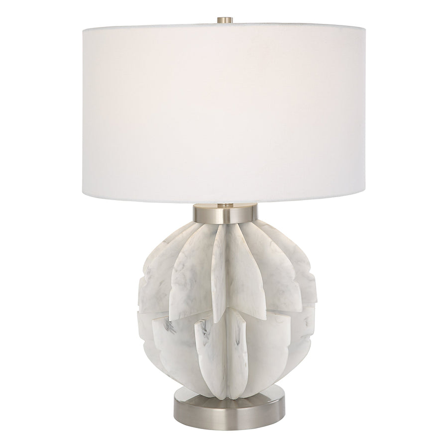 This Contemporary Table Lamp Features Thin Stacked Blades That Create An Organic Sphere Finished In A White Marble Look Accented By Plated Brushed Nickel Accents.